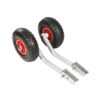 Транцевые колеса, установленные на моторно-гребную лодку ПВХ с жестким транцем, существенно, упрощают транспортировку судна от воды до места стоянки. Закрепляются на транцевой плите при помощи винтов и гаек. Имеют фиксаторы в рабочем и сложенном положении. Надувные колеса позволяют приспособиться к различному типу грунта, изменяя давление в шине.
